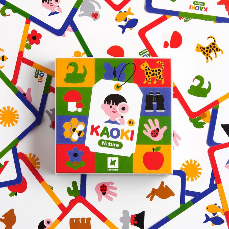 Open your eyes and remember 5 drawings in 5 seconds! Kaoki Nature is a game of observation and memory. Each card has 5 designs per side. Of the 5 drawings, 4 are present on both sides, the 5th drawing is present on only one side of the card. As soon as the card is memorized, it is turned over. The player who is the fastest to name the drawing that is new wins the card. A fast and intuitive pocket game that stimulates children's concentration and sense of observation.